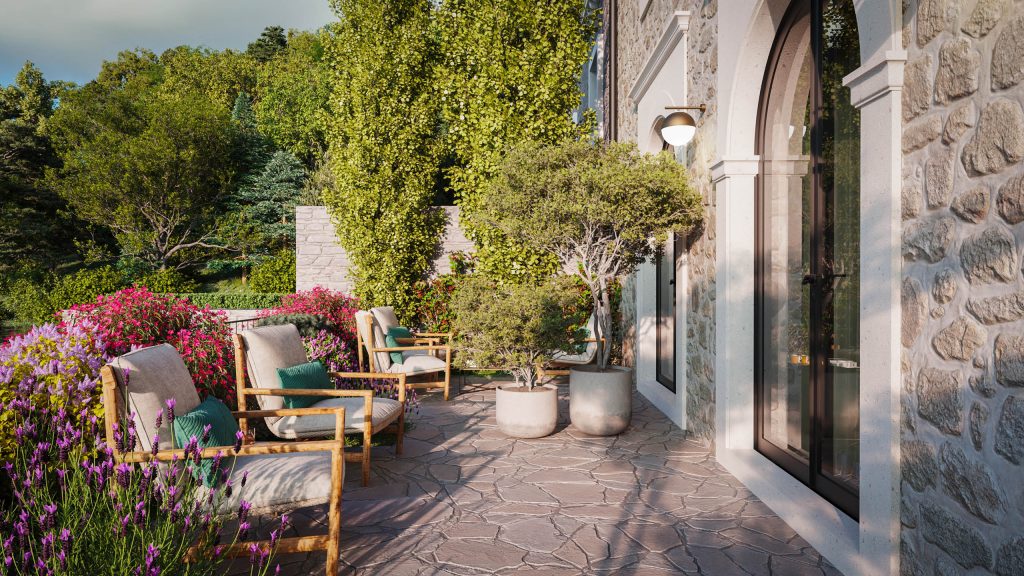 Volumeni se fragmentiraju oko središnjeg dvorišta, gdje odnos punog i laganog definira zaštićeni atrij. Glavni prostor se otvara prema unutarnjem vrtu, dok središnja jezgra organizira i razdvaja funkcije po etažama.